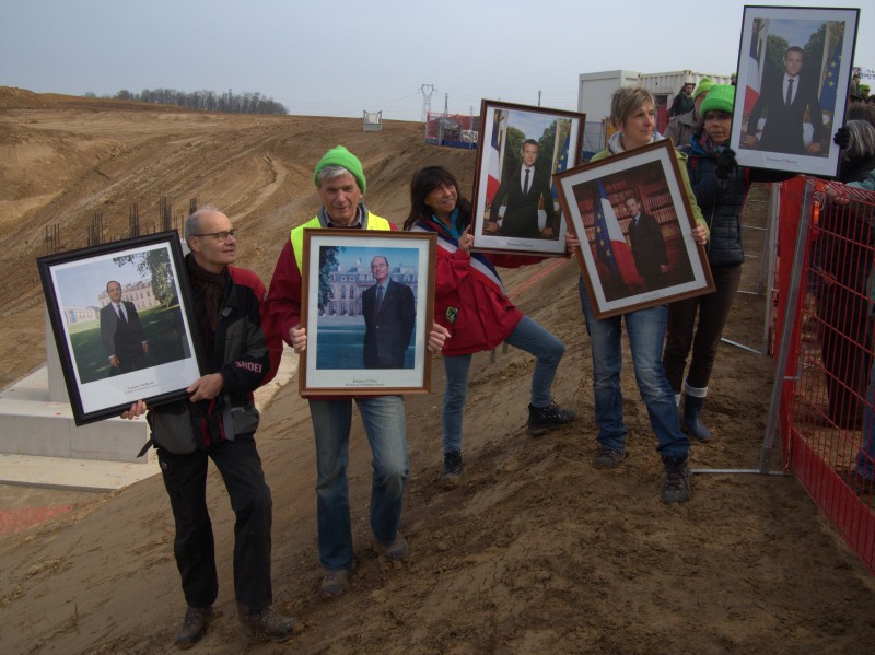 Ces élus, ces citoyens et ces citoyennes n'y sont pas allés de main morte, en amenant 5 portraits de présidents français dont 2 d'Emmanuel Macron sur le chantier du Grand Contournement Ouest de Strasbourg (GCO). Ils dénoncent surtout la dualité de nos dirigeants, qui "font de beaux discours sur l'environnement depuis longtemps, mais qui empirent la situation dans les faits."#GCO#Macron#Sarkozy#Hollande#Ries#Chirac