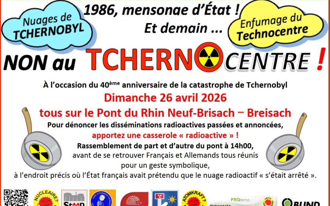 A l’initiative de Stop Fessenheim, un collectif d’associations badoises et alsaciennes organise une manifestation en mémoire de la catastrophe de Tchernobyl dont ce sera le 40ème anniversaire, et pour réaffirmer sa ferme opposition au projet de Technocentre porté par EDF sur le site de Fessenheim.